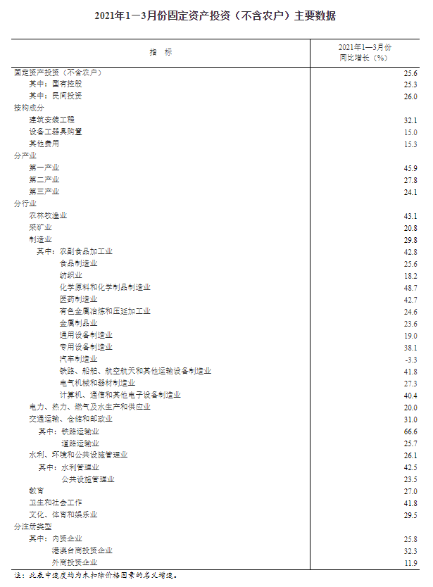 4月16日周五,国家统计局发布数据显示,1—3月份,全国固定资产投资(不含农户)95994亿元,同比增长25.6%;比2019年1—3月份增长6.0%,两年平均增长2.9%;经季节调整后与去年10—12月份环比增长2.06%。