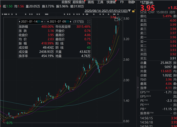 wind数据显示,截至最新收盘,*ST新光报3.95元/股,股价较今年初已暴涨400%,市值达72亿元。