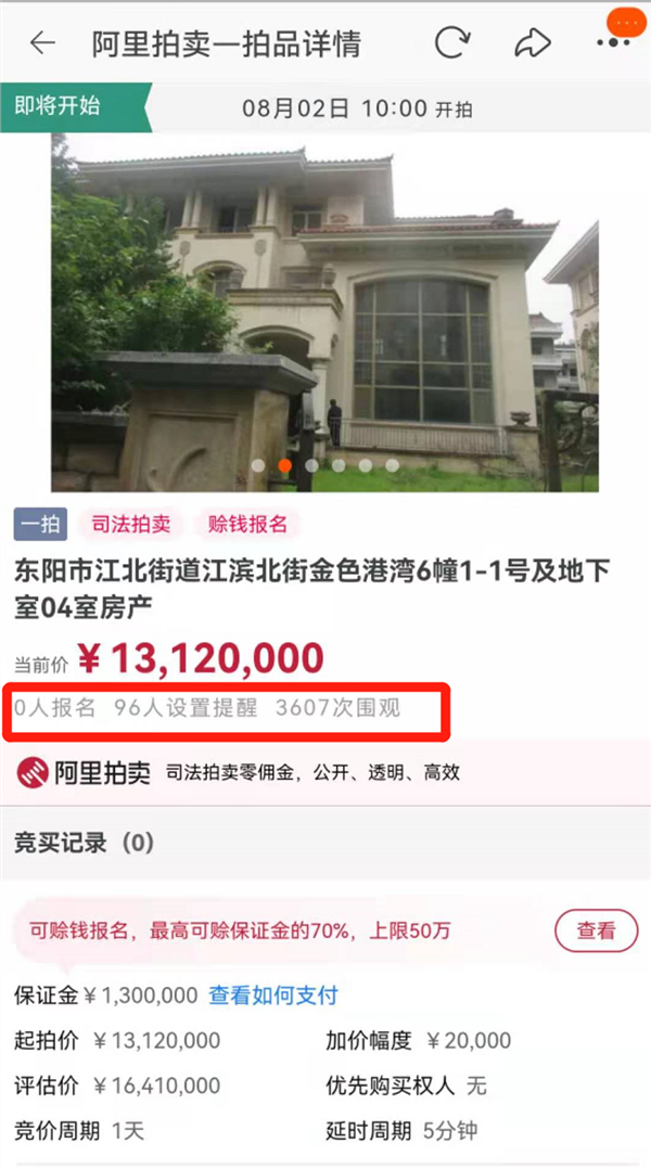 阿里拍卖信息显示,8月2日起至8月5日期间,浙江省金华市中级人民法院每天都将以1312万元的起拍价开拍一套别墅,合计四套,每套评估价约为1640万元。